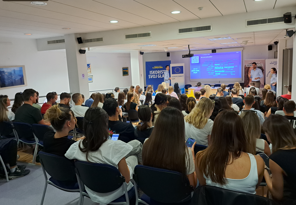 Ovog ponedjeljka, 15. travnja 2024., u Gradskoj knjižnici “Marko Marulić”, a u suradnji s EU Direct-om, organizirali smo konferenciju “I moj glas vrijedi” na koju smo pozvali učenike naših partnerskih EPAS škola iz Splitsko-dalmatinske te susjedne Šibensko-kninske županije kako bismo ih osnažili i pripremili za europske izbore koji se održavaju 9. lipnja, ali i parlamentarne koji su planirani za 17. lipnja. Na konferenciji su nam se pridružili i učenici iz suradničke „Gimnazije Fra Grge Martića“ iz Posušja koji će u lipnju sudjelovati u biranju hrvatskih europarlamentaraca.