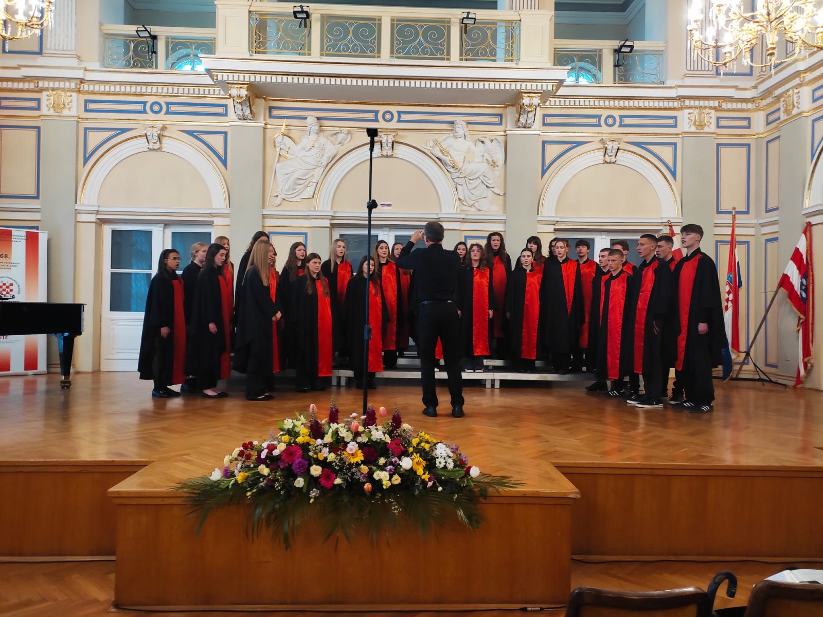 Zlatni zboraši By Karolina ViđakMay 8, 2025May 9, 2025Mješoviti pjevački zbor, Naslovnica, Natjecanja Naši zboraši osamnaesti put zaredom osvojili su 1. mjesto i zlatnu plaketu u Varaždinu na državnomom natjecanju mješovitih pjevačkih zborova u kategoriji srednjih škola. Čestitamo zborašima i njihovom prof. Tomislavu Veršiću! 2 Image 5 of 10
