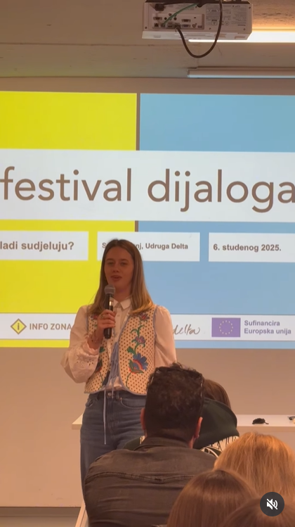 u četvrtak, 6. studenog 2025., učenici s izborne nastave Politike i gospodarstva, sudjelovali su na prvom Festivalu dijaloga koji se održavao u splitskom Domu mladih i Zoni. Ovaj festival je organizirala Info zona u partnerstvu s Udrugom Delta i Udrugom IKS u sklopu projekta “Uključivanje mladih: kako dalje?”, koji se financira sredstvima Europske unije kroz program Erasmus+.