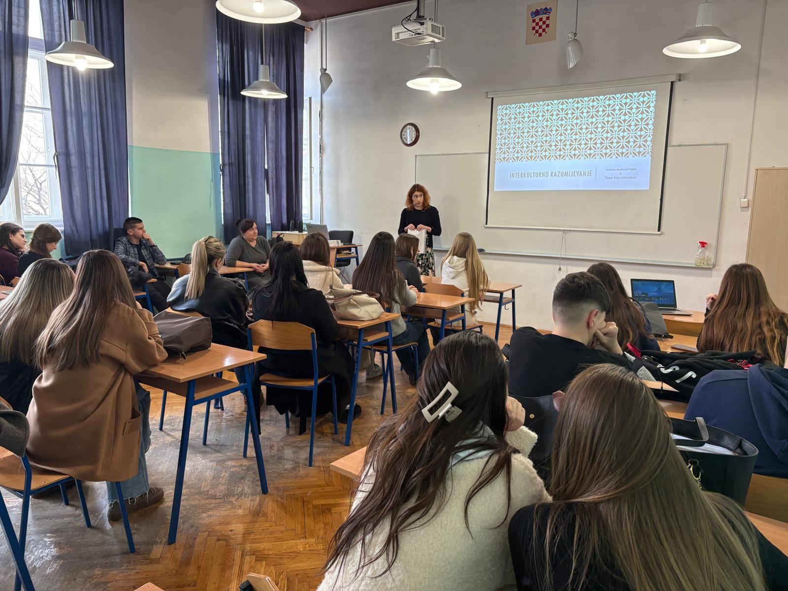 Ovog smo utorka ugostili sociologinje iz Udruge MI, Tijanu Tešija Nikolašević i Antoniu Matković Puljek koja je i sama nekad pohađala našu gimnaziju i izbornu nastavu uz Politike i gospodarstva. Naše gošće predstavile su projekt Ministarstva rada, mirovinskog sustava, obitelji i socijalne politike vezan uz rad u području integracije izbjeglica iz Ukrajine a u kojem trenutno aktivno sudjeluju.